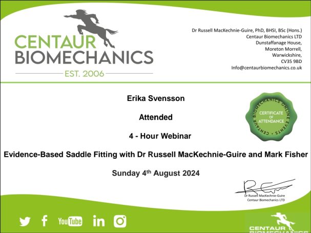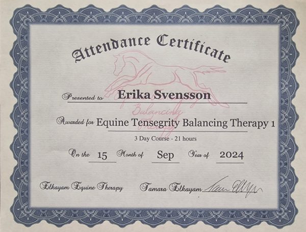 Balancing Therapy: Jag har även deltagit i Equine Theraphy Balancing Therapy Level 1 under 2024 och planerar att fortsätta med Level 2 hösten 2025.