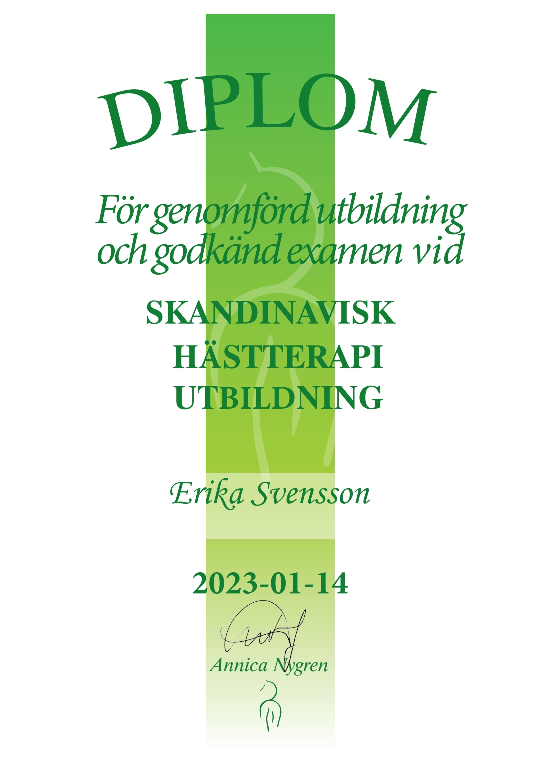 Hästterapeut: Jag påbörjade min utbildning på Skandinavisk Hästerapi 2021 och blev färdig diplomerad hästterapeut i januari 2023. Du hittar mer information på deras hemsida: http://www.shuvet.se